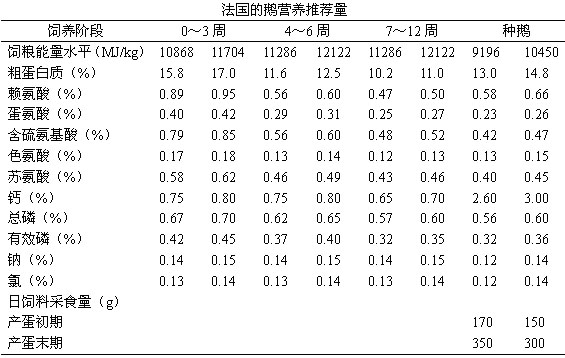 目前,现代畜牧业发达国家都制定有本国的各种畜禽的饲养标准,用于科学饲养,指导生产,提高畜禽产品率,降低饲料消耗,节省成本,取得最佳的经济效益。世界上较着名的畜禽饲养标准有美国NRC饲养标准、英国ARC饲养标准、新日本饲养标准等。前些年,我国已制定了鸡的饲养标准试行草案,以供养禽生产者参考应用。但对鹅的营养需要还在继续探索,尚未制定全国统一的符合我国鹅种特点的鹅的饲养标准。因而在养鹅实践中,往往引用和借鉴国外的饲养标准。总的来看,目前国内外有关鹅的营养需要的资料较少。现介绍美国NRC“家禽营养需要1994年,第9版)中有关鹅的营养需要、前苏联鹅的饲养标准、法国的鹅营养推荐量、朗德鹅的参考饲养标准,见下表。