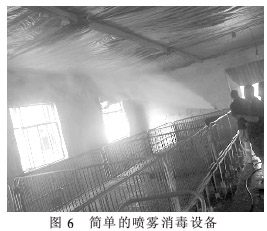 4.1.1.做好消毒工作,即做好门卫消毒、进生产区消毒、进猪舍消毒、日常消毒、即时消毒和定期舍内喷雾消毒(见图6)等工作,对进场人员、车辆、生产工具、器具、圈舍及舍内空间、排污道、走道及场区道路、装猪台、仓库、住室等处及生产区人员的工作服进行严格消毒。
