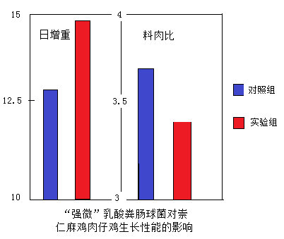 ”乳酸粪肠球菌,试验组崇仁麻鸡肉仔鸡比对照组的日增重提高了14.74%,料肉比降低了8.33%,且差异显着。此外,试验组仔鸡死亡数量也低于对照组。