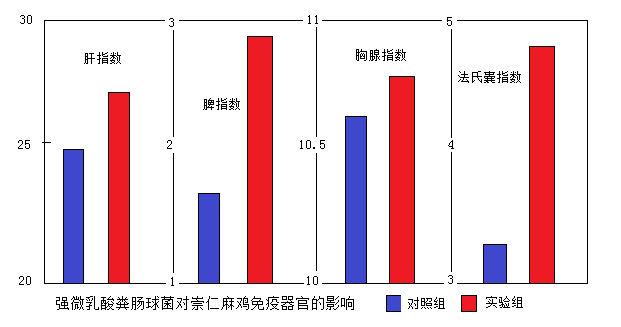 免疫功能的高低取决于免疫器官的状况。禽类的免疫器官主要是肝、胸腺、脾脏和法氏囊。一般认为免疫器官重量降低为免疫抑制所致,而免疫器官重量增加则为免疫增强的表现。家禽的免疫器官重量可以用来评价雏鸡的免疫状况,免疫器官指数反映了机体4个主要免疫器官的生长发育程度。在动物健康的情况下,免疫器官的指数越高,动物的免疫功能越强。