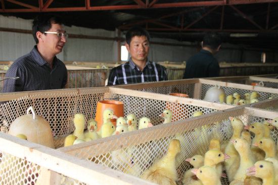 在农科院与前来会面的鄱阳湖大型肉鹅养殖场赵老板(左一)会合,将去鄱阳湖赵老板养鹅场考察肉鹅养殖试验场地