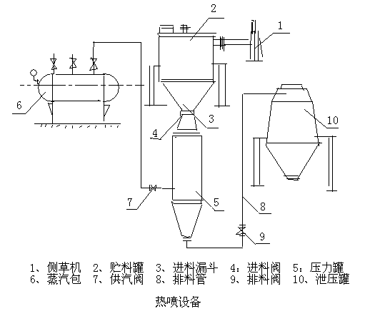 因此饲料热喷技术是由特殊的热喷装置及其独特有的工艺流程来完成的,目前国内生产的饲料热喷机是由内蒙古自治区畜牧科学院发明的(专利号:8520477),由呼和浩特市锅炉厂生产的热喷6型饲料加工机组,实际上是一种间歇式气流膨化机。