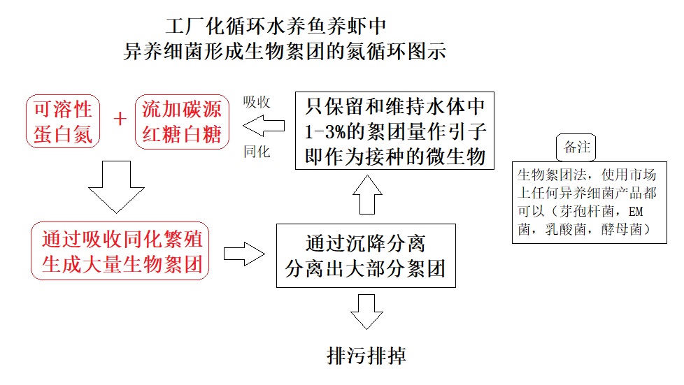 只有异养细菌的话,整个氮循环过程是这样的:粪便残饵溶解于水中的蛋白氮,通过结合投入的糖碳源,通过异养细菌复杂的分解吸收,转运到各细胞组织,通过DNA转录,信息传达,蛋白质重组,不断组成异养细菌细胞蛋白和细胞器,再拉伸细胞,分裂成两个细胞,完全一代繁殖过程 ,再不断通过繁殖形成更多的异养细菌细胞,这些细胞通过和水中有机碎屑结合,成为菌胶团即生物絮团,悬浮于养殖水体中,通过曝气的剪切作用,不断分化成更多的生物絮团,生物絮团越来越多,多到系统增氧都难以承受,所以,必须用设备,不断收集生物絮团,沉降分离生物絮团,把多余的生物絮团分离出去,只保留1-3%的生物絮团悬浮于池水中;如下图;
