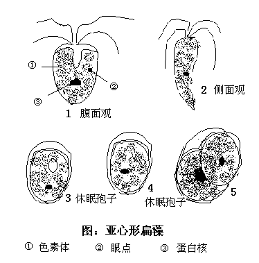 无性生殖,细胞纵分裂形成2个,少数情况下为4个子细胞,环境不良时形成休眠孢子。