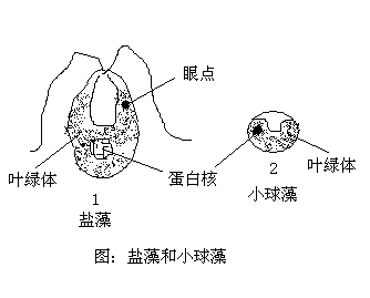 形态特征:盐藻没有细胞壁,细胞外只有一层弹性膜,所以体形变化很大,有梨形,椭圆形,长颈形和纺锤形等。体内有一个杯状的色素体,色素体内的色素,主要是叶绿素,生活条件不良时,产生血红素,藻体呈现红色。在色素体内靠近基部有一大的蛋白核。细胞上部有一个红色的眼点。有一个细胞核,位于中央原生质中。前端生出两条等长的鞭毛,鞭毛比细胞长约1/3。细胞长16—24微米,宽10—13微米。见图: