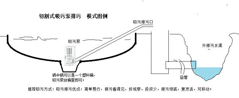 购买切割式吸污泵,在底部为锅形的池塘中央,再挖一个直径1米深0.3米左右的锅形坑,即池塘中间是锅中锅的形式,吸污泵就放在这个小坑中,开启吸污泵就可以吸污了,这个方式对于之前没有做拔管式排污设施的养殖户来说,是一种很好的弥补方式,操作简单,安装简单,也非常的方便;