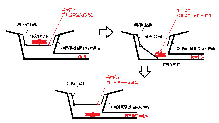 每天进行2~3次排污,开关阀门或拉起铁球等操作,隔离虾壳和死虾,再用温和的分段拔管排污一分钟(上段拔管排污);
