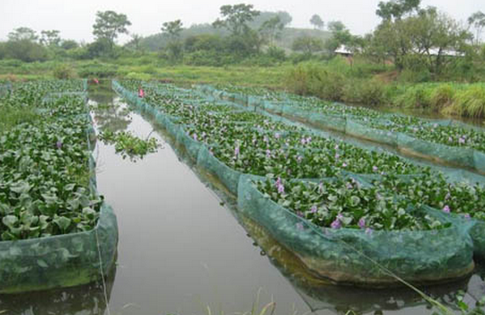 、水草的铺设:水泥池在浸洗完成后,应排干池水重新注入新水,即可在池内铺设水草。土池则可直接铺设水草。水泥池和土池水草的铺设方法为:选用新鲜的水浮莲,将选好的水草紧密地铺入池内,四周用竹杆挡住,使离池壁40厘米内没有水草,以防水草着生于池边而给黄鳝的逃跑带来方便。网箱内可铺设水花生或水浮莲均可。若水草生长不够茂盛,可先泼洒一些腐熟的人畜粪水进行培养。